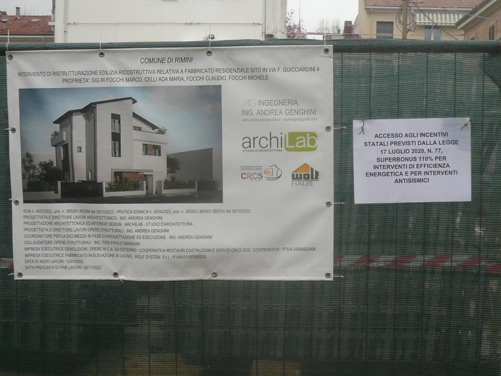 Intervento di ristrutturazione edilizia, che ha riguardato la demolizione e ricostruzione di fabbricato residenziale sito in Rimini, via Francesco Guicciardini 4. Il nuovo fabbricato ha struttura portante in legno ed è costituito da piano terra, piano primo e piano secondo, con copertura a falde inclinate. L′edificio è suddiviso in due unità immobiliari, ciascuna delle quali disposta sui tre livelli.
